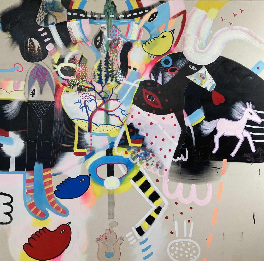 Mama Bear, Baby Bear, Acrylic and collage on canvas, 6′ x 6′, 2024